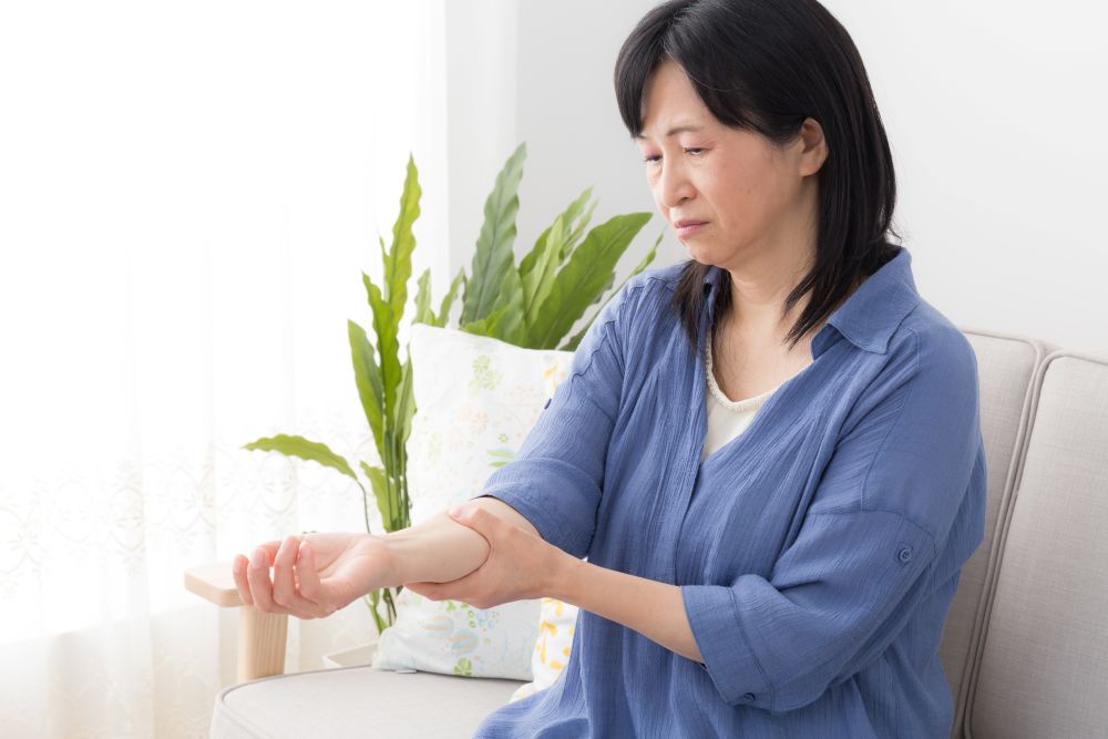 指を曲げた時や伸ばした時に、指の付け根(特に親指や中指)に痛みが出ることがあります。 また、曲げ伸ばしの途中で指が引っかかるような感覚が生じ、スムーズに動かしにくくなることもあります。